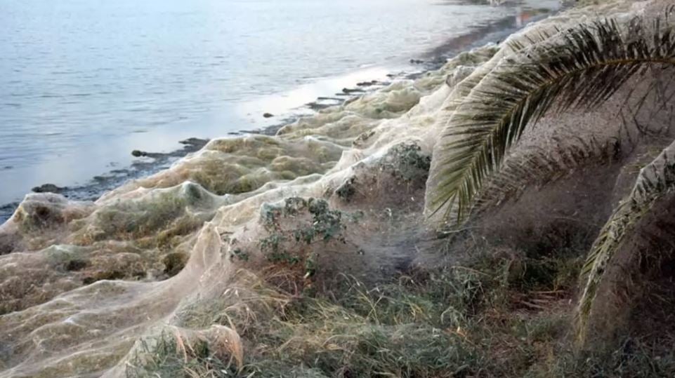 Jättiläismäinen hämähäkinseitti on peittänyt laajan merenranta-alueen Länsi-Kreikassa Aitolikon kaupungissa, kertoo Daily Hellas.