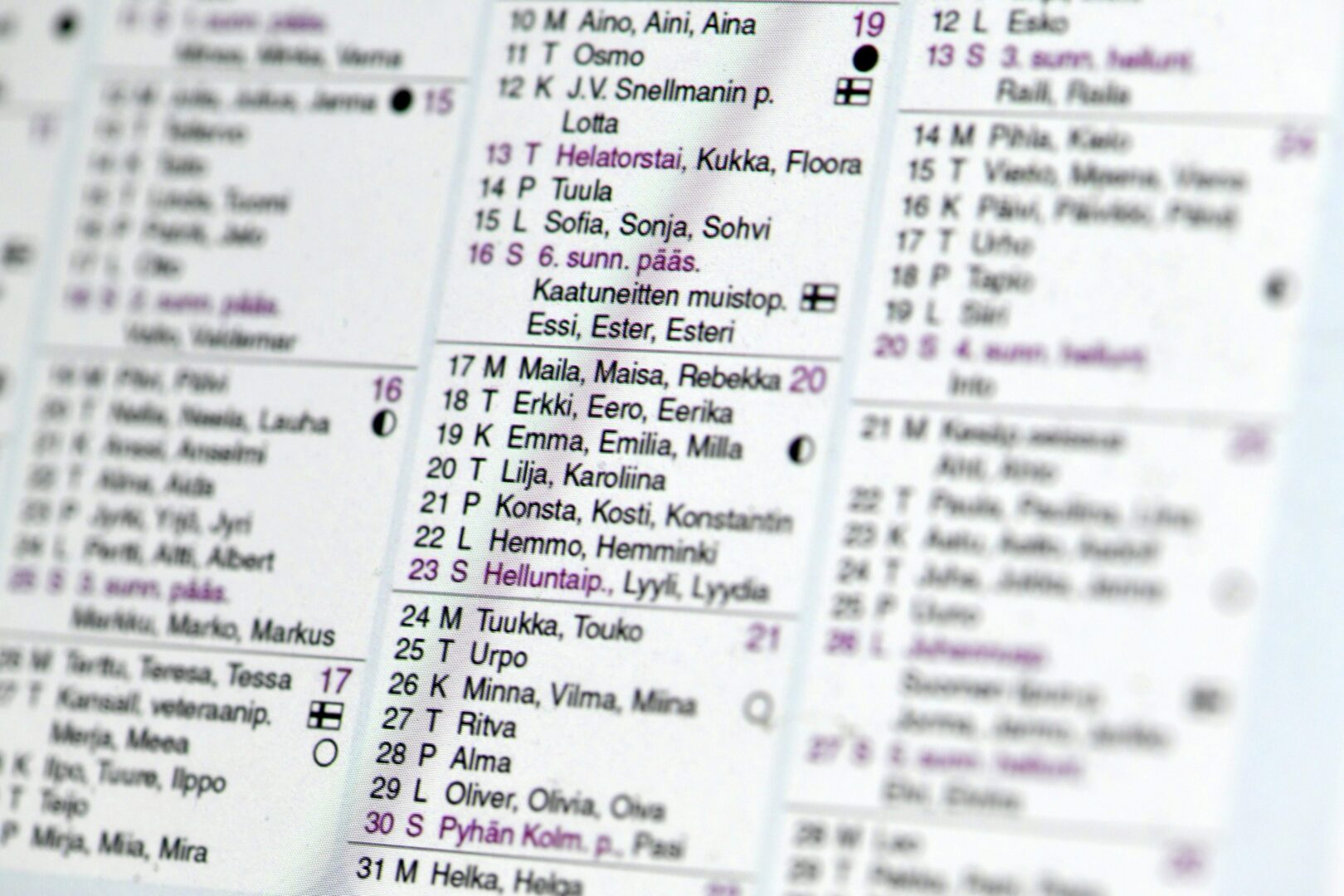 – Tärkeä periaate on myös, että samat nimet sijoitetaan kummassakin kalenterissa samalle päivälle. Näin esimerkiksi Camilla ja Linus löytyvät vuonna 2025 samoilta päiviltä suomalaisesta ja suomenruotsalaisesta kalenterista, Saarelma-Paukkala kertoo.