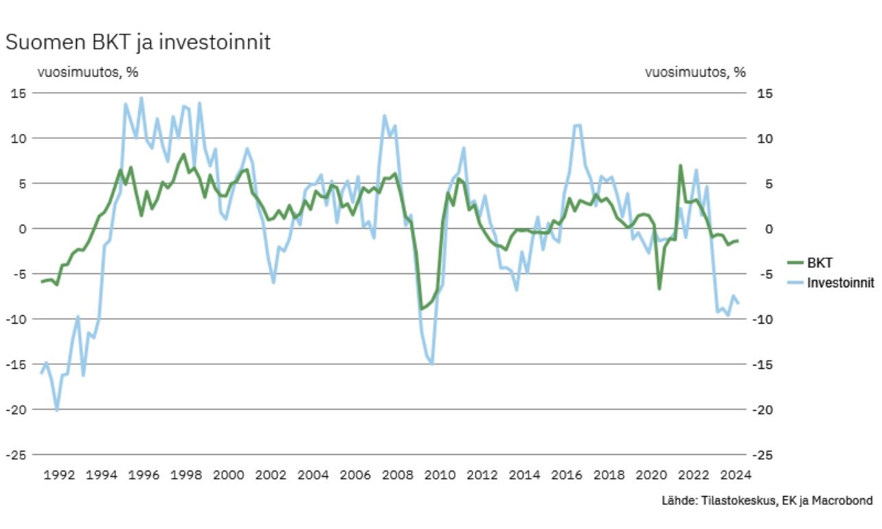 Hän viittaa viestipalvelu X:ssä jakamaansa graafiin. Siitä ilmenee, että Suomen bruttokansantuote laski viime vuonna 1,2 prosenttia ja investoinnit laskivat 8,8 prosenttia. Graafin tiedot perustuvat Tilastokeskuksen, EK:n ja Macrobondin lukuihin.