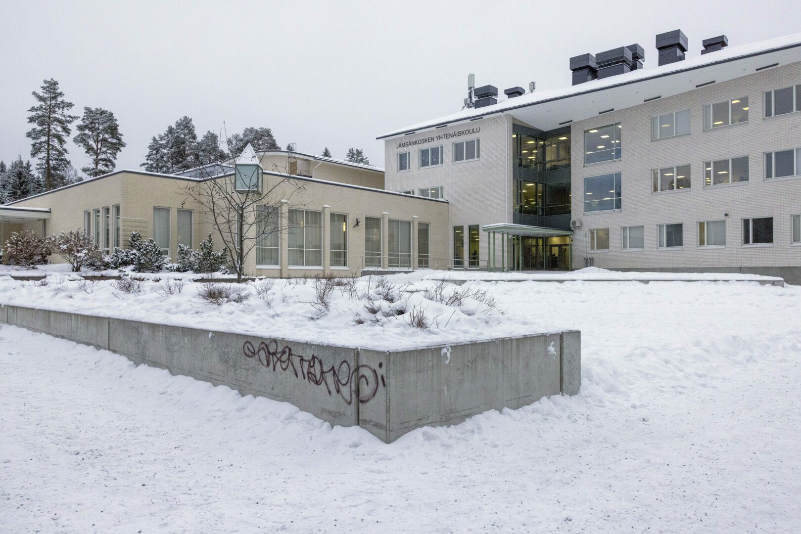 Jämsänkosken yhtenäiskoulu Jämsässä. Poliisi epäilee, että kaksi alle 15-vuotiasta nuorta on suunnitellut kouluiskua Jämsässä Keski-Suomessa. Poliisin mukaan epäillyt suunnittelivat kolmen ihmisen tappoa tai murhaa Jämsänkosken koulussa. LEHTIKUVA/TOMMI ANTTONEN