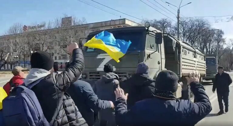 Jutun alta löytyvällä videolla näkyy, kuinka aseettomat ja Ukrainan lippuja heiluttavat ihmiset kerääntyvät venäläisten Z-symboleilla varustettujen sotilasajoneuvon eteen. Kuorma-autot peruuttavat ja lopulta kaasuttavat ihmisjoukkoa karkuun.