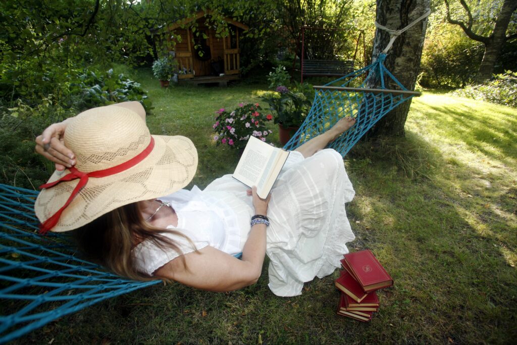 Nainen lukee riippukeinussa. LEHTIKUVA / Sari Gustafsson