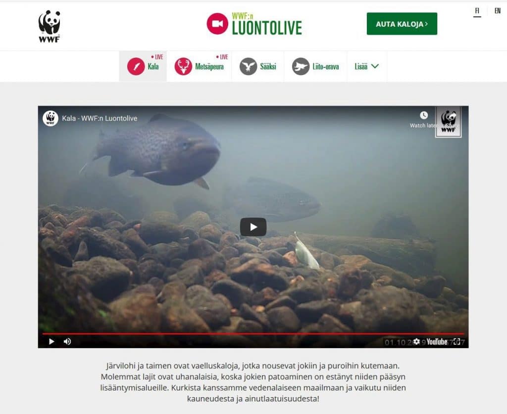 Tänä vuonna WWF:llä on ollut Suomen luonnossa kaikkiaan seitsemän eri livekameraa. Hiitolanjoen kalojen lisäksi niiden kautta on voinut seurata metsäpeuran, kalasääsken eli sääksen, liito-oravan, kyyn, saimaannorpan ja ahman elämää.