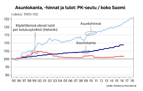 Hintojen nousu heikentää tavallisten perheiden asunnon hankinnan kykyä. Pääkaupunkiseudun asukkaiden tulot eivät ole muuttuneet koko maan lukuihin verrattuna. Korkeammat asuntohinnat tarkoittavat siis suurempaa velkataakkaa asunnon hankkijalle.
