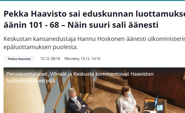 Ulkoministerille eduskunnan luottamus äänin 101-68