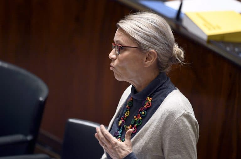 Sdp:n Johanna Ojala-Niemelä esittää ministereille karenssia.
