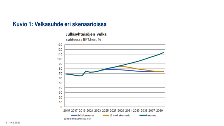 Valtiovarainministeriön esittämillä sopeutustoimilla velkasuhde on jäämässä nykyiseen yli 70 prosenttiin.