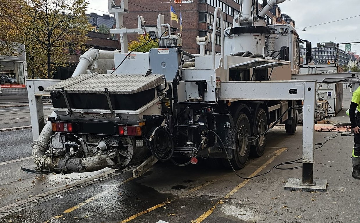 Kuvassa on nähtävissä, kuinka betonipumppuauton tukijalat ovat toisella puolella keskellä pyörätietä ja toisella puolella keskellä jalkakäytävää.