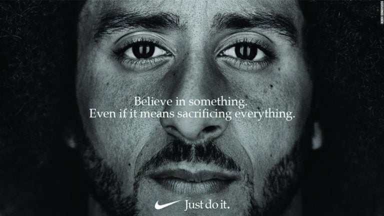 Mainoksessa esiintyvä Kaepernick aloitti amerikkalaisen jalkapallon ammattilaisliiga NFL:ssä protestit, joissa pelaajat polvistuivat peliä edeltävän kansallislaulun aikana. Pelaajat halusivat polvistumalla vastustaa USA:n poliisiväkivaltaa, joka suuntautuu heidän mukaansa vähemmistöjä vastaan.
