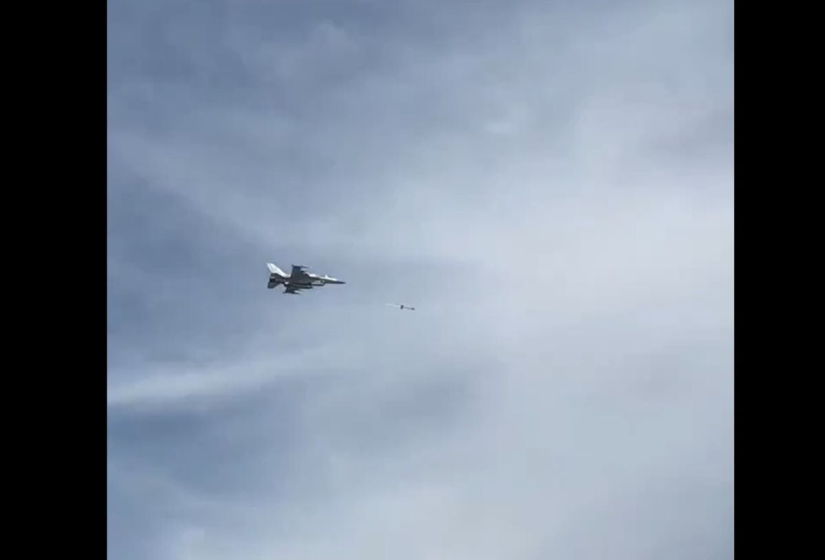 Vain hetkeä myöhemmin paikalle ilmestyi Arabiemiraattien F-16E-hävittäjä, joka laukaisi ilmataisteluohjuksen kohti iranilaista droonia.