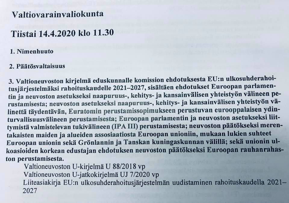 Valiokunnan tiistaisen kokouksen esityslistalla kyseessä oli kolmas kohta. Se kuului seuraavasti: