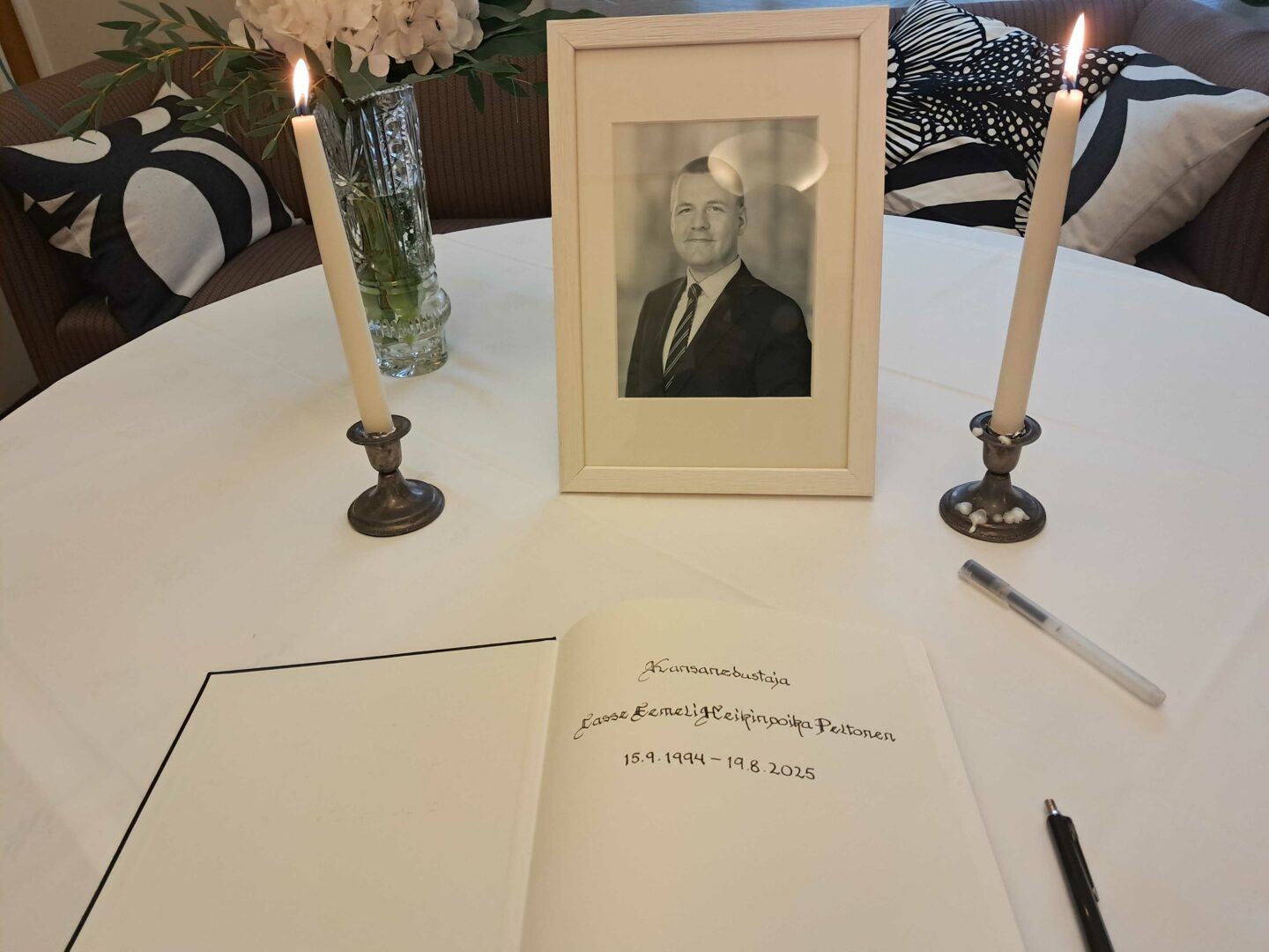 SDP:n ryhmähuoneessa eduskunnassa oli tiistaina esillä Eemeli Peltosen surukirja.