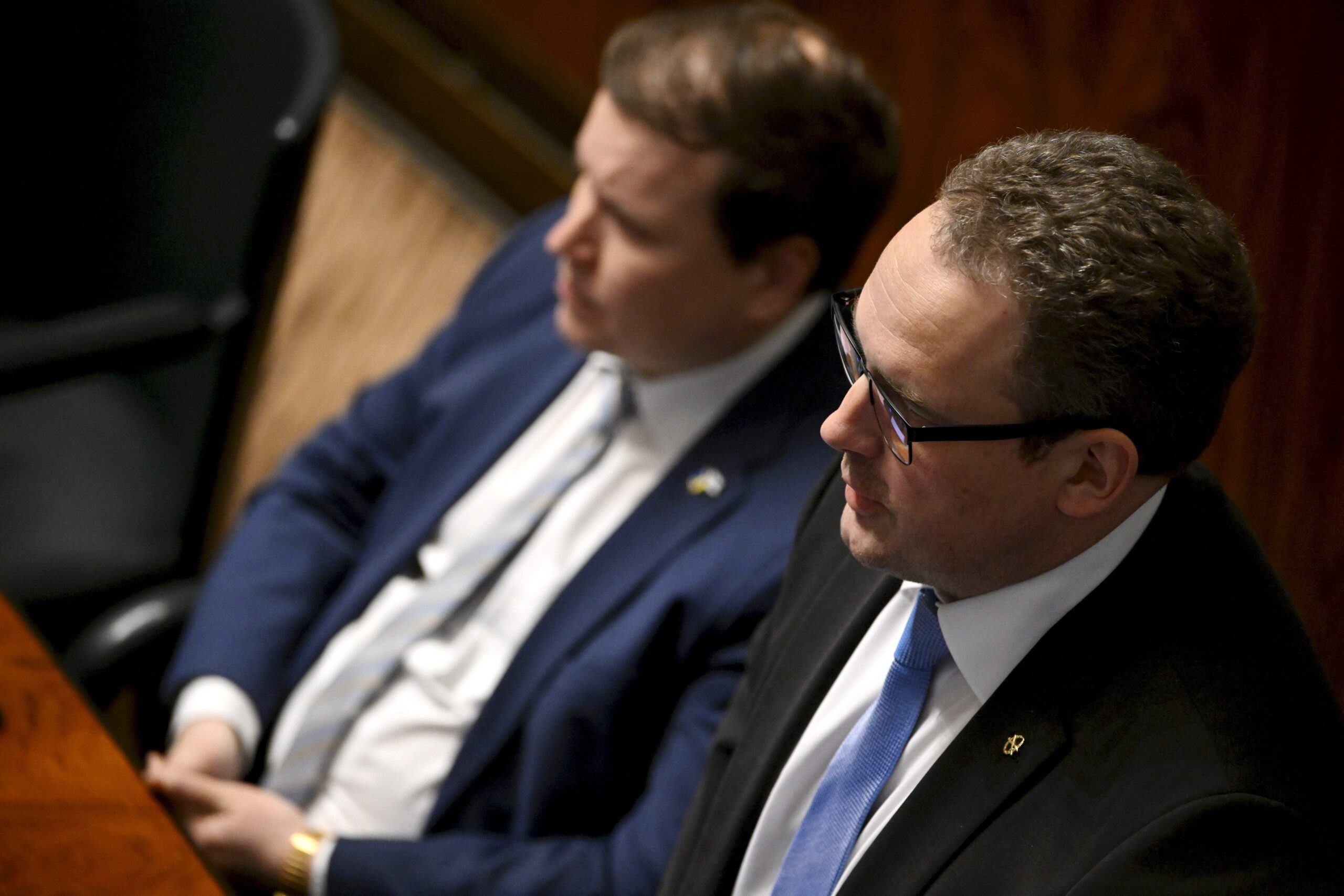 Perussuomalaisten Ville Tavio (vas.) ja Jani Mäkelä. LEHTIKUVA / ANTTI AIMO-KOIVISTO