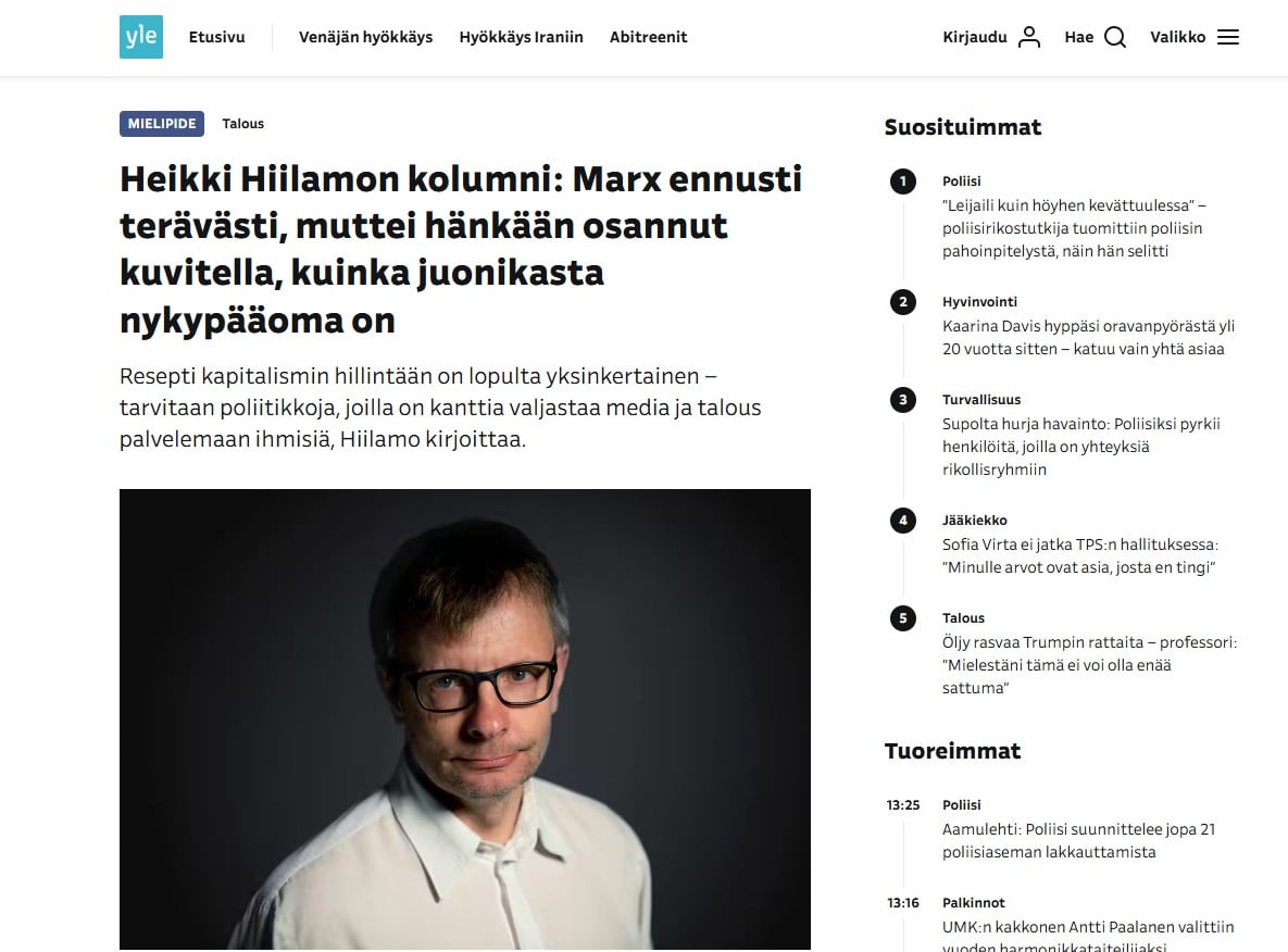 – Noin puolet kolumneista oli vasemmistolaisia. Pari kolumnia eli alle kymmenesosa oli oikeistolaisia. Loput luokittelin neutraaleiksi. Viimeksi mainitun jäännösryhmän koko kertoo luokittelun vaikeudesta. Esimerkiksi metsästystä puolustava mutta kapitalismikriittinen kolumni joutui neutraaliin koriin, Heikki Pursiainen avaa.