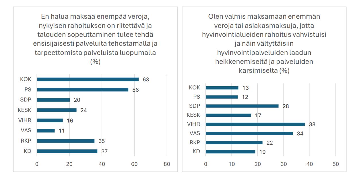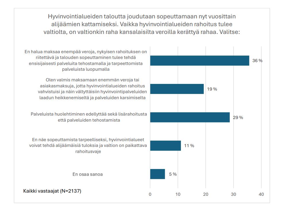 Yli kolmannes (36 %) vastaajista kertoo, ettei halua maksaa lisää veroja, vaan nykyisen rahoituksen on riitettävä ja talouden sopeuttaminen tulee tehdä ensisijaisesti palveluita tehostamalla ja tarpeettomista palveluista luopumalla.