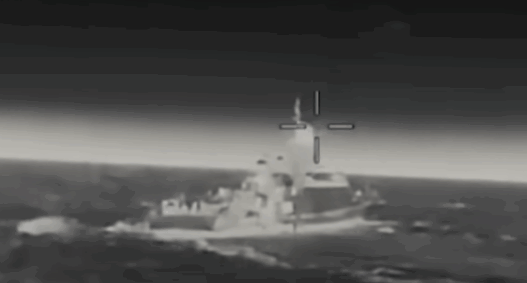 Heti sen jälkeen toinen drone lähestyy alusta takaviistosta ja osuu sen kylkeen.