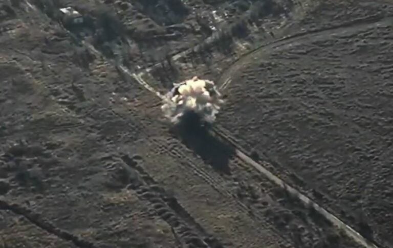 Venäläislennokki tulee lopulta laskuvarjolla alas sitä operoineen venäläisen ryhmän ja heidän ajoneuvonsa lähelle. Videolla näkyy lennokin luokse tulevia venäläisiä. Hetkeä myöhemmin raketin täysosuma peittää ajoneuvon räjähdykseen.