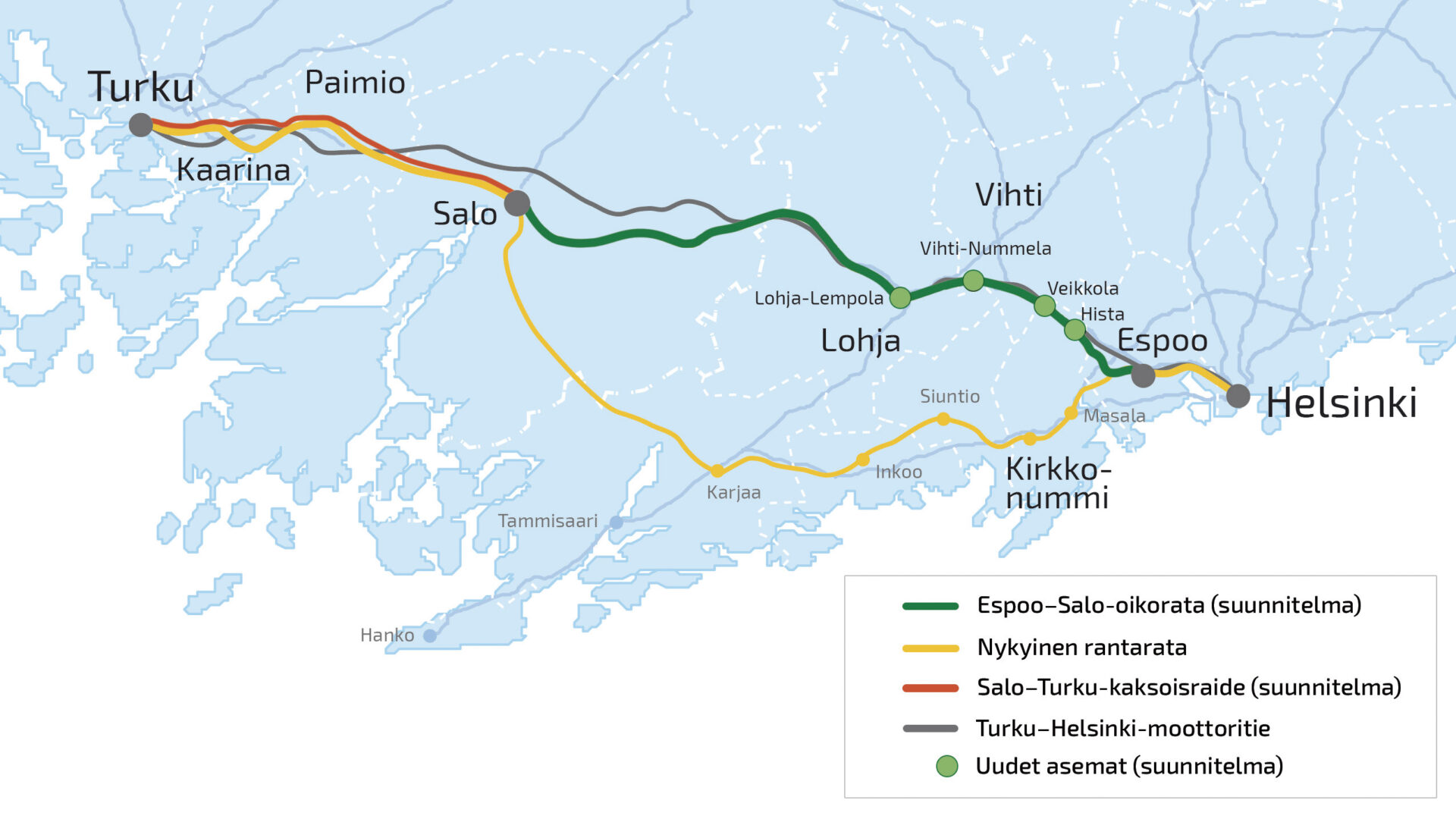 Väyläviraston mukaan oikorata olisi osa Helsingin ja Turun välistä nopeaa junayhteyttä.