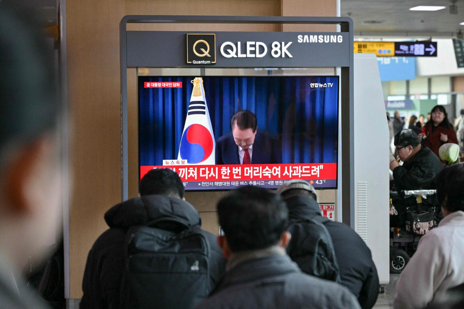Ihmiset seurasivat Etelä-Korean presidentti Yoon Suk-yeolin televisioitua puhetta pääkaupunki Seoulin juna-asemalla. AFP / LEHTIKUVA / ANTHONY WALLACE