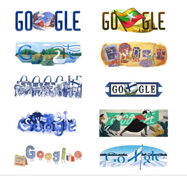 Googlen doodle eli logopiirros kunnioittaa tänään 6. joulukuuta 2018 Suomen itsenäisyyspäivää.