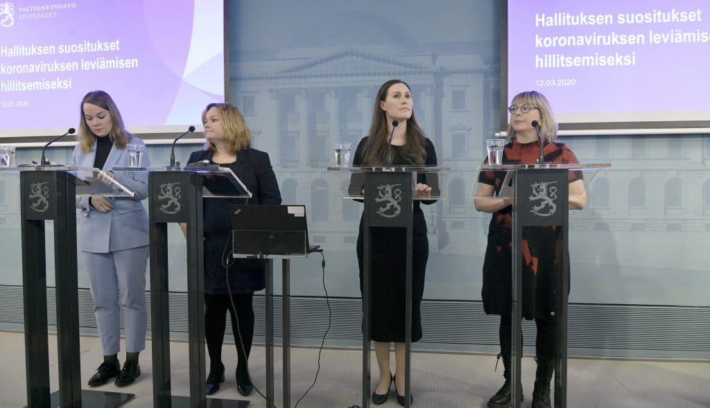 Paikalla tiedotustilaisuudessa ovat pääministeri Sanna Marin (sd.), valtiovarainministeri Katri Kulmuni (kesk.), sosiaali- ja terveysministeri Aino-Kaisa Pekonen (vas.), perhe- ja peruspalveluministeri Krista Kiuru (sd.)  ja opetusministeri Li Andersson (vas.).