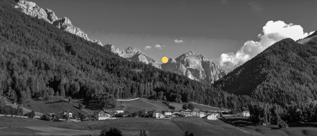 Jutun alta löytyvällä videolla katsojan on ensin tuijotettava taukoamatta 30 sekunnin ajan kuvan keskellä olevaa keltaista pistettä. Tämän jälkeen vuorimaisema vaihtuu mustavalkoiseen kuvaan, mutta katsoja näkee optisen harhan takia kuvan väreissä.
