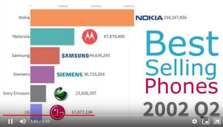 Alla näkyvä kanavan video Most Popular Mobile Phone Brands 1993-2019 näyttää matkapuhelinvalmistajien myynnin osuuksia ja suuruuksia, oka voi sinänsä kuulostaa tylsältä, mutta suomalaisille palkeilla on erityistä kiehtovuutta.