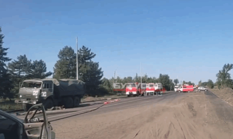 Paikan päällä venäläisten sotilaiden kuvaamassa videossa näkyy valtava savupatsas sekä useita tuhoutuneita ja sirpaleiden lävistämiä sotilasajoneuvoja.