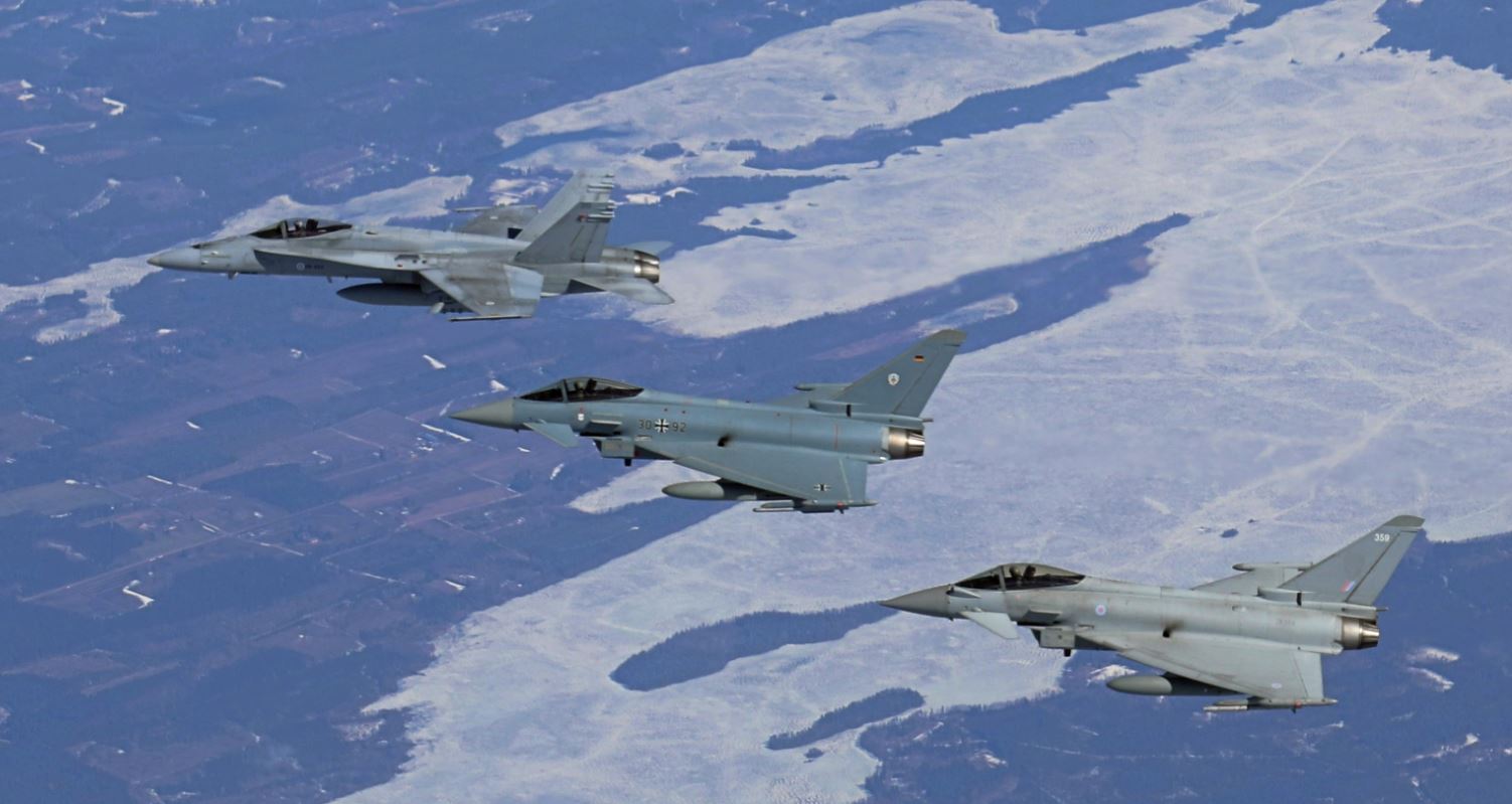 Suomen ilmatilassa lennettiin keskiviikkona kaksi yhteistoimintakierrosta, joihin osallistui Karjalan lennoston Suomen Hornetien lisäksi Saksan ja Britannian Eurofighter Typhoon -hävittäjiä Ämarin tukikohdasta Virosta.