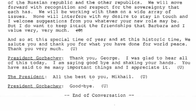 Bush ylisti Gorbatshovin saavutuksia. Kolmeliuskainen dokumentti kertoo maailmanhistoriallisen puhelun päättyneen näin:
