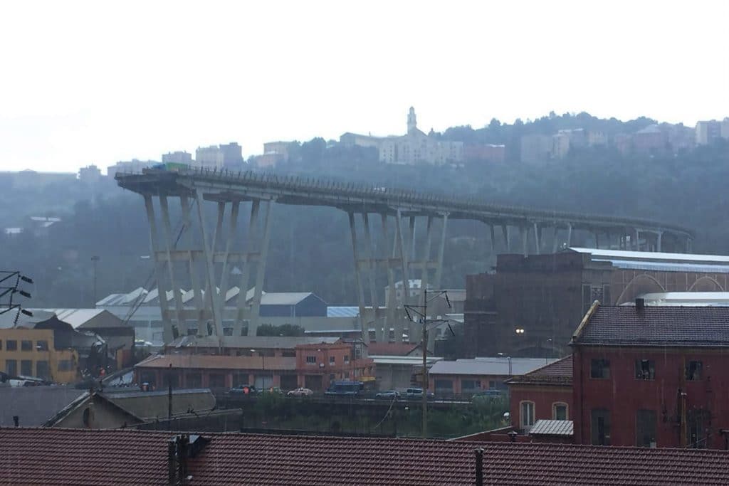 Here is an aerial view that shows the collapse of part of the Ponte Morandi motorway bridge in Genova, Italy, where 22 are confirmed dead so far. (video from @farmaciaserrage) pic.twitter.com/zlfugqf0BY