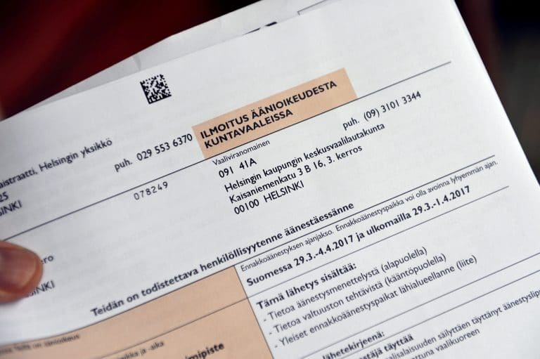 Äänioikeuden ilmoituskortti kertoo vaalipäivän äänestyspaikan. Lisäksi kirjeessä on liitteenä luettelo äänioikeutetun oman vaalipiirin ennakkoäänestyspaikoista.