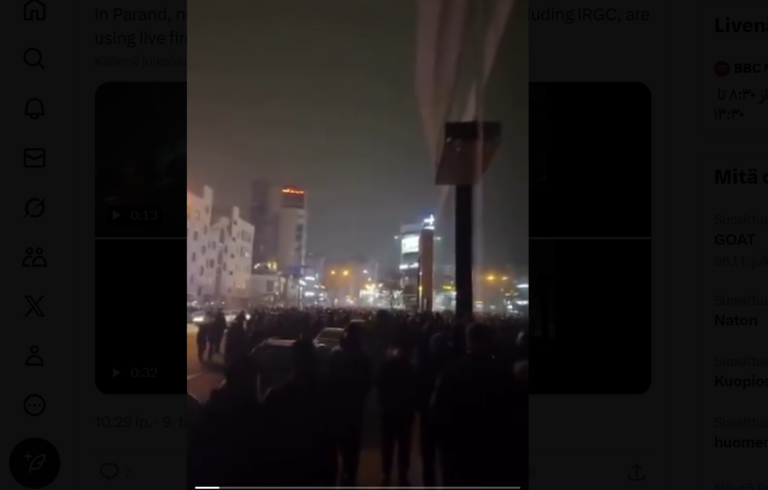 Sosiaalisessa mediassa leviää paljon videoita Iranin eri kaupungeista. Osalla jaetuista videoista ihmiset juoksevat pakoon samalla, kun maan turvallisuusjoukkojen kerrotaan pyrkivän hajottamaan mielenosoituksia väkivaltaisesti.