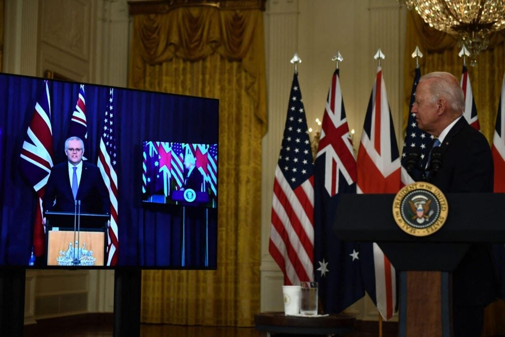 Biden, Australian pääministeri Scott Morrison ja Britannian pääministeri Boris Johnson kertoivat sukellusvenesopimuksesta yhteisessä tiedotustilaisuudessaan. Tilaisuus järjestettiin videolinkin kautta. Biden kiittää tilaisuudessa kollegoitaan: