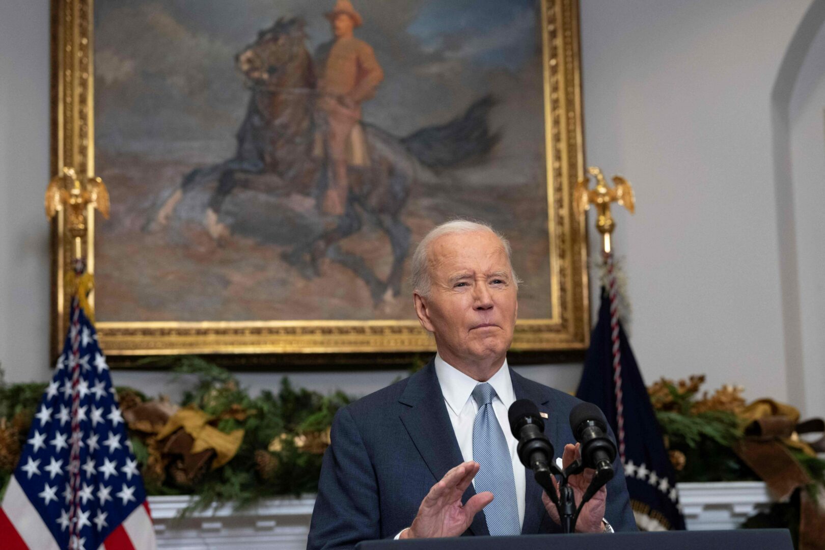 Yhdysvaltain presidentti Joe Biden puhuu Syyrian tilanteesta sunnuntaina Valkoisessa talossa. AFP/LEHTIKUVA/CHRIS KLEPONIS
