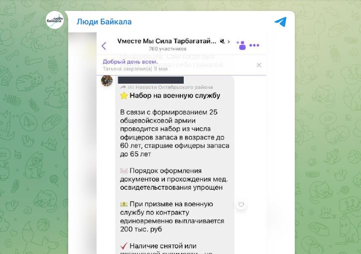 Asiasta kertovan Ljudi Baikalan Telegram-kanavalla julkaistujen kattavien tietojen mukaan siperialaisille on alkanut tulla hämmentäviä viestejä. Telegramissa on julkaistu kuvakaappaus asukkaille tulevasta Viber-viestistä. Siinä on viranomaisten yhteystiedot. Viestin mukaan palvelukseen kutsutaan reservin upseereita aina 65 ikävuoteen asti.