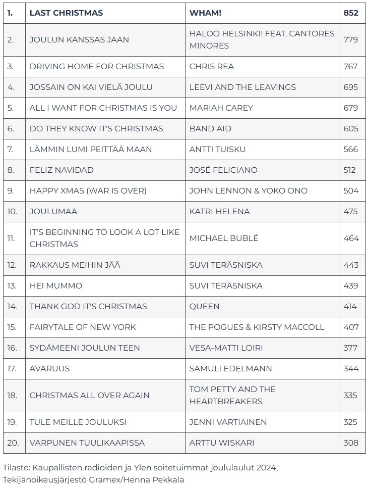 Wham-yhteen Last Christmas otti haltuunsa joululistan kärkipaikan 852 soittokerralla. Kappale on hallinnut listojen kärkeä kestomenestyjänä: Gramexin tilastoissa kärkipaikka on nyt jo kuudes 2010-luvulta alkaen.