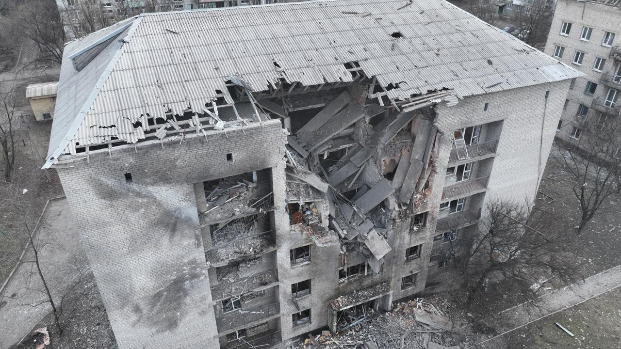 Sodassa tuhoutunut rakennus Ukrainassa. AFP / LEHTIKUVA / HANDOUT