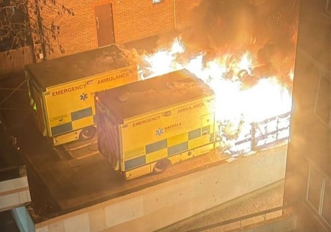 Epäillyt tuhopolttajat tallentuivat valvontakameroihin. BBC:n julkaisemalla tallenteella näkyy kolme epäiltyä, jotka kävelevät ambulansseille ennen niiden syttymistä.