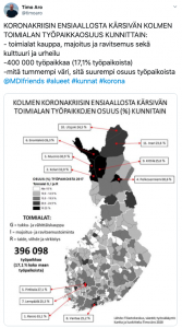 – Koronakriisin ensiaallosta kärsivän kolmen toimialan työpaikkaosuus kunnittain: Toimialat kauppa, majoitus ja ravitsemus sekä kulttuuri ja urheilu. 400 000 työpaikkaa (17,1% työpaikoista). Mitä tummempi väri, sitä suurempi osuus työpaikoista @MDIfriends #alueet #kunnat #korona, Aro kirjoittaa.