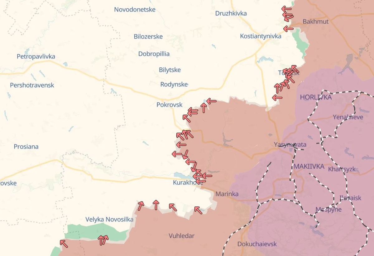 Venäjän puolustusministeriö väitti maan asevoimien vallanneen viikonlopun aikana Kurakhivkan ja Vyshneven paikkakunnat Pokrovskin lähellä. Alivoimaiset ukrainalaisjoukot ovat joutuneet Kyiv Independent -lehden mukaan vetäytymään myös Toretskin kaupungin suunnalla Donetskin alueella.