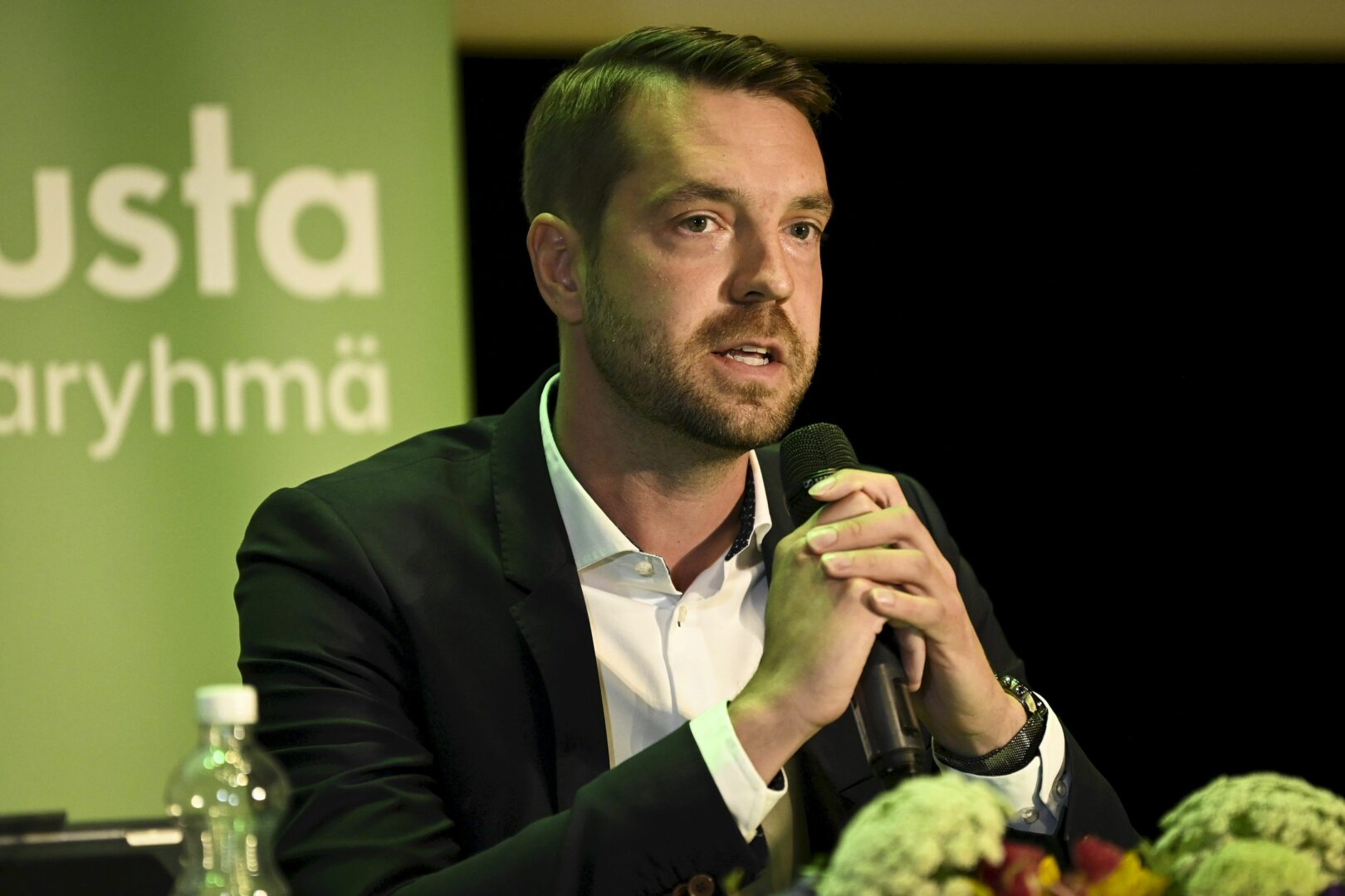 Kansanedustaja Petri Ovaska (kesk.) kertoo kuunnelleensa aamupäivällä valtiovarainministeri Riikka Purran puhetta perussuomalaisten puoluevaltuustolle.