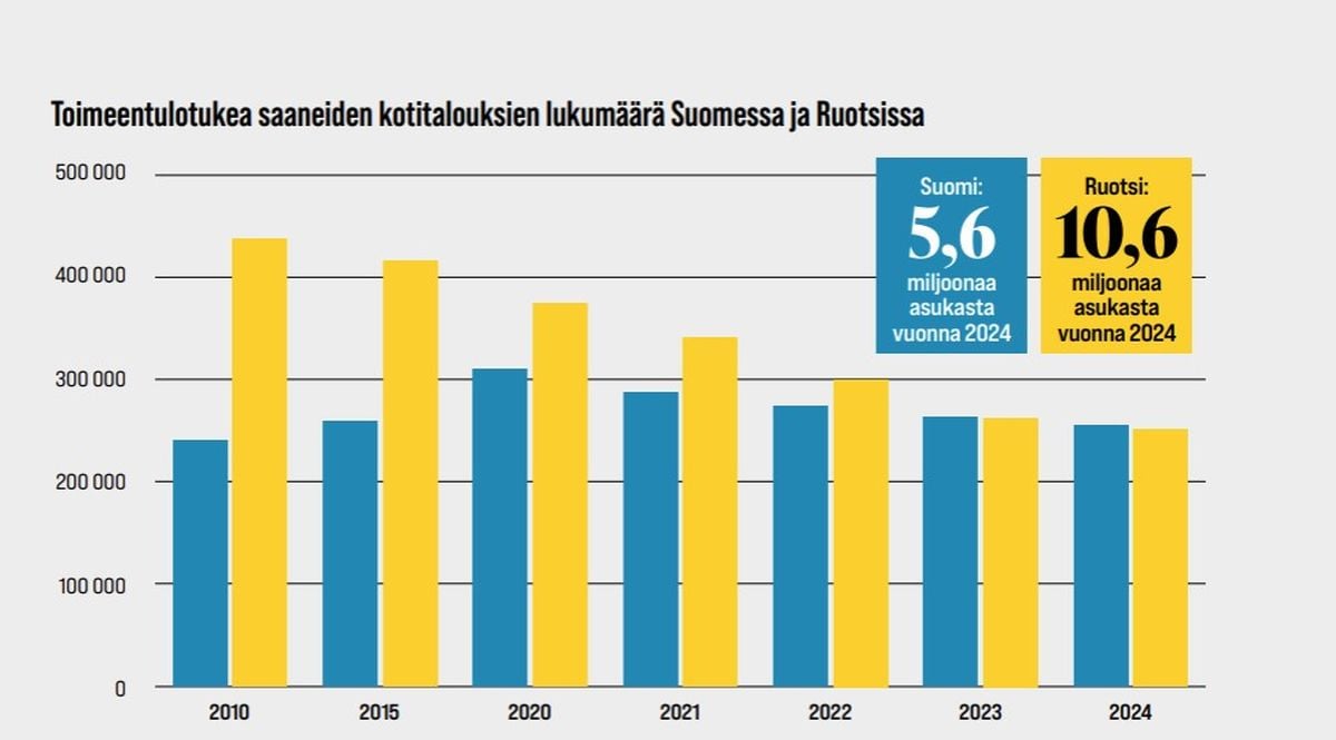 Vesittyminen on näkynyt siinäkin, että toimeentulotuen saajien absoluuttinen lukumäärä on Ruotsissa ja Suomessa samaa luokkaa (Ruotsin vastaava etuus on nykyään nimeltään Ekonomiskt bistånd) eli runsaat 300 000 henkilöä, vaikka Ruotsi on meitä kaksi kertaa isompi maa (kts. graafi).