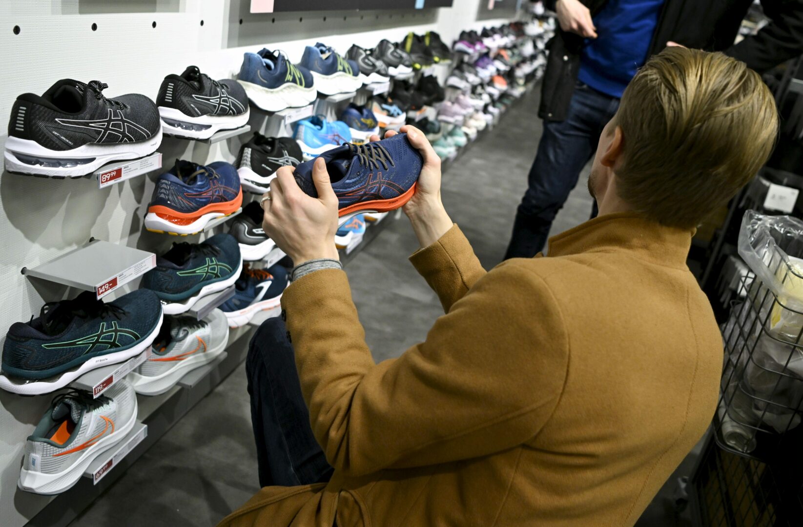 Mies urheiluliikkeessä, ostamassa kenkiä. LEHTIKUVA/VESA MOILANEN