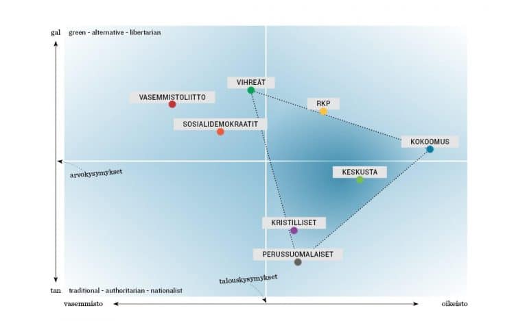 Esiin tulee asetelma, jossa puolueet ryhmittyvät keskenään melko selkeään kolmioon. Sen yhdessä kulmassa ovat ryppäässä vasemmistoliitto, SDP ja vihreät. Toista kulmaa dominoi perussuomalaiset. Kolmas kulma kartan oikealla puoliskolla on kokoomuksen hallussa.