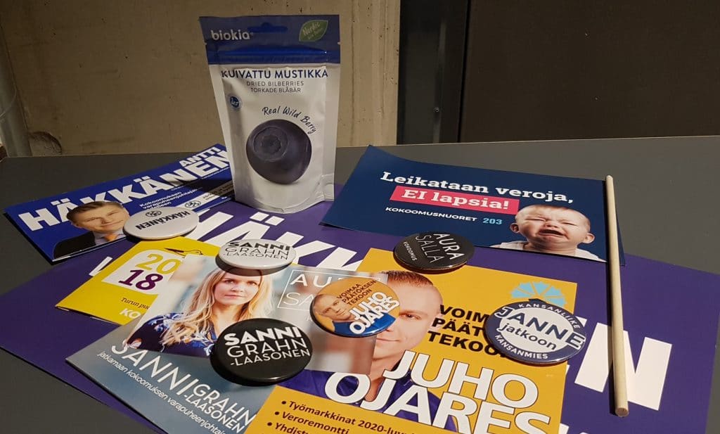 Antti Häkkänen hakee näkyvyyttä isoilla jaettavilla pahvijulisteilla. Mari-Leena Talvitien #joukkuepelaaja-kampanja erottuu jakamalla kuivattujen suomalaisten mustikoiden pikkupakkauksia.