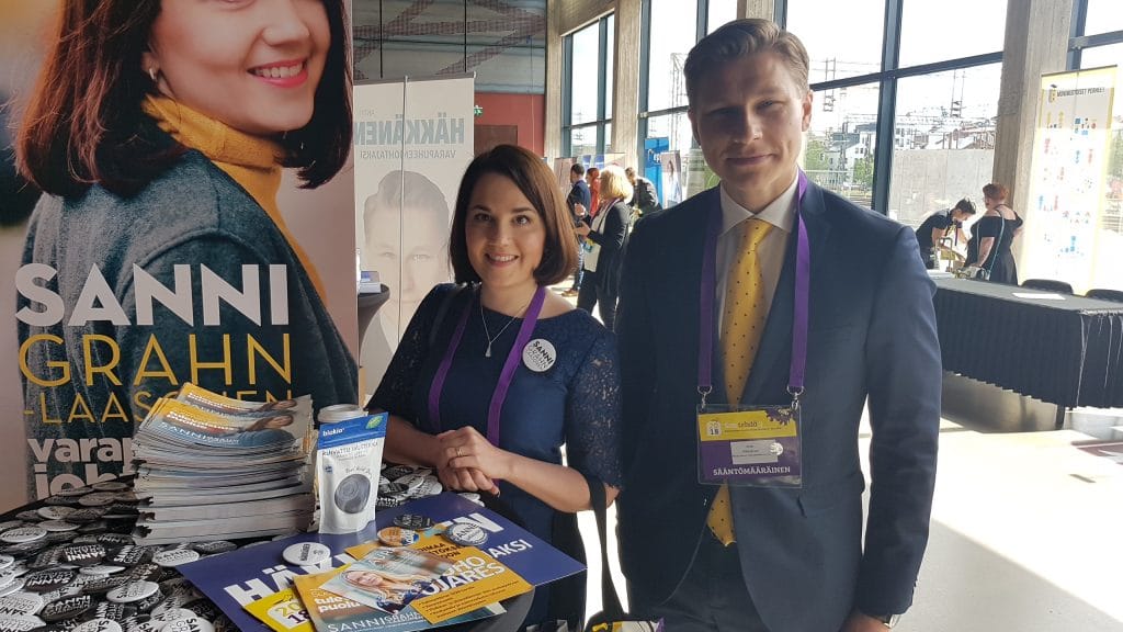 Varapuheenjohtajavaalin kilpakumppanit ja Aura Salla ovat pystyttäneet puoluekokouspaikalle Turun Logomoon näyttävät mainosstandinsa. Kaikilla on jaossa rintamerkkejä ja lennäkeitä, ja tulossa on kunkin omia jippoja.