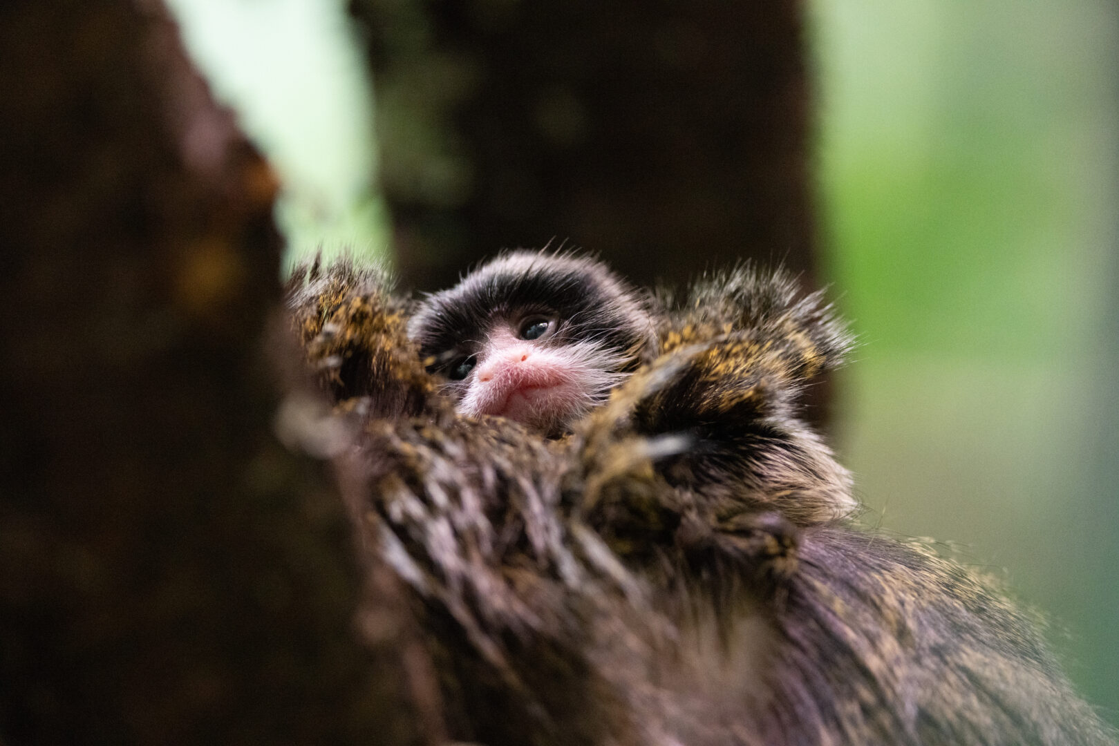 Keisaritamariini-isä huolehtii poikasesta ja vie sen emolle imetettäväksi parin tunnin välein. Kuva: Annika Sorjonen, Korkeasaaren eläintarha