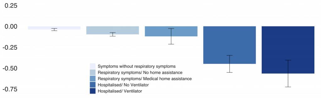 Tutkitusta 84 285 henkilön ryhmästä 60 kertoi joutuneensa hengityskoneeseen sairaalassa, 147 henkilöä oli sairaalassa osastohoidossa, 3 642 kärsi hengitysvaikeuksista ja 9 201 oli sairastunut lievemmin.