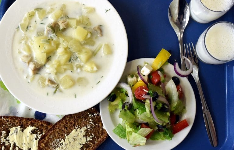 Kouluruokailusuositusten mukainen koululounas koostuu pääruoasta, salaatista, ruokajuomasta, leivästä ja leipärasvasta ja kattaa oppilaan päivittäisestä energiantarpeesta kolmanneksen.